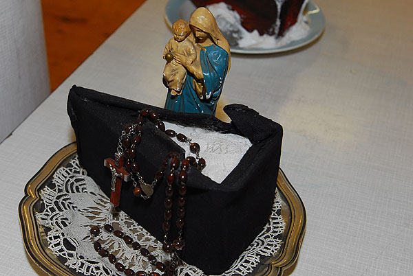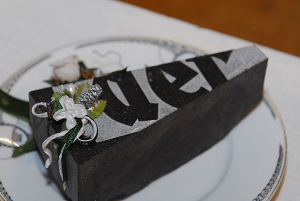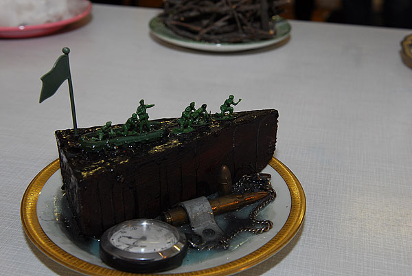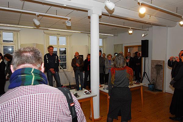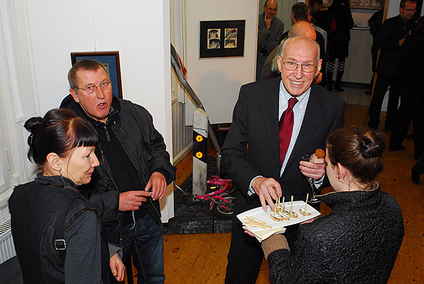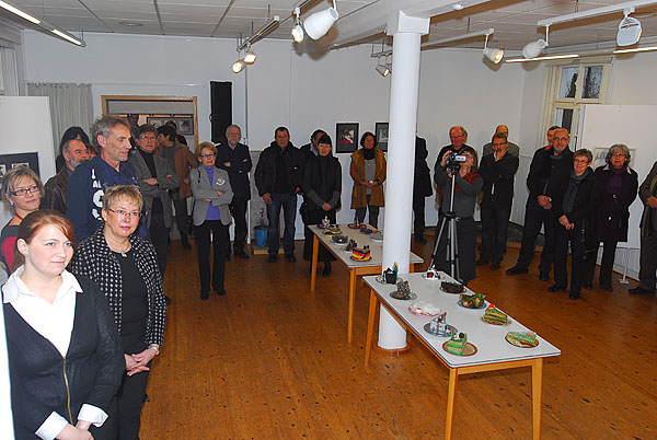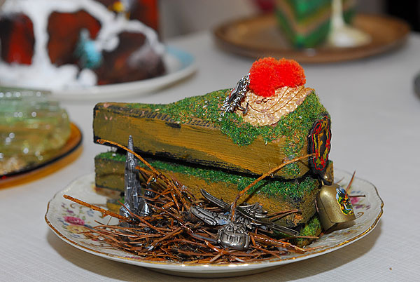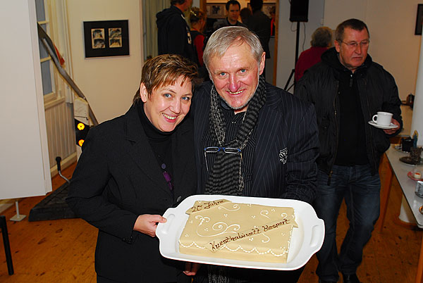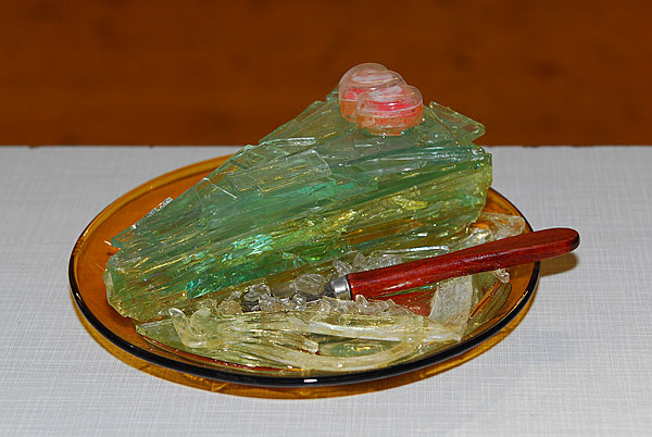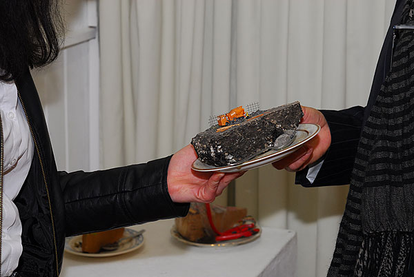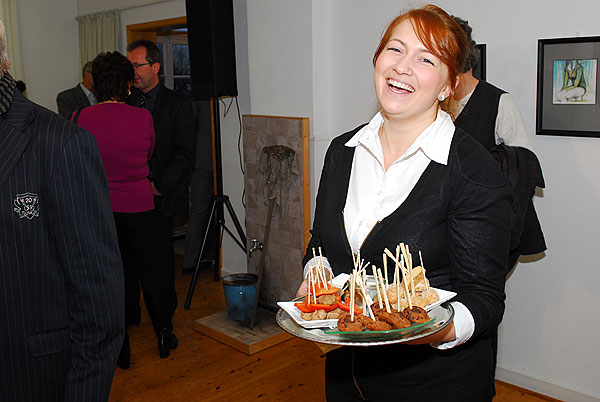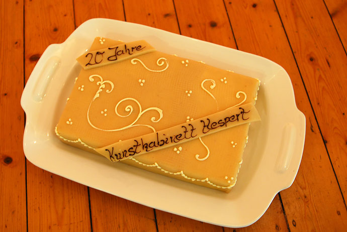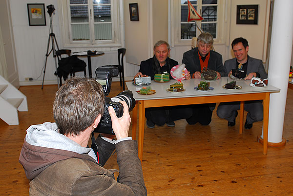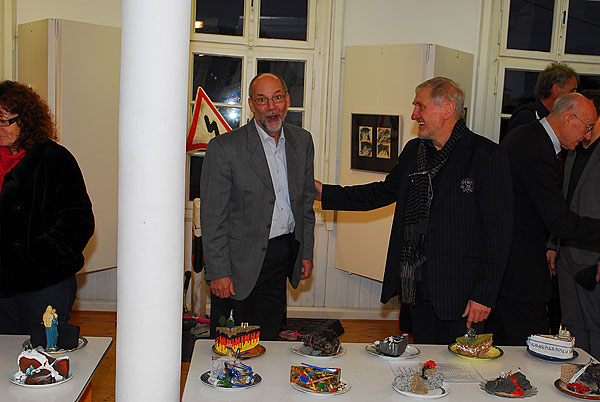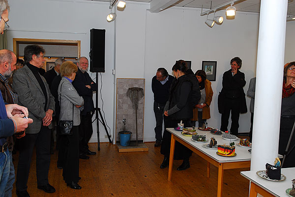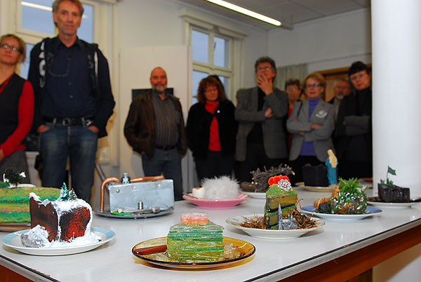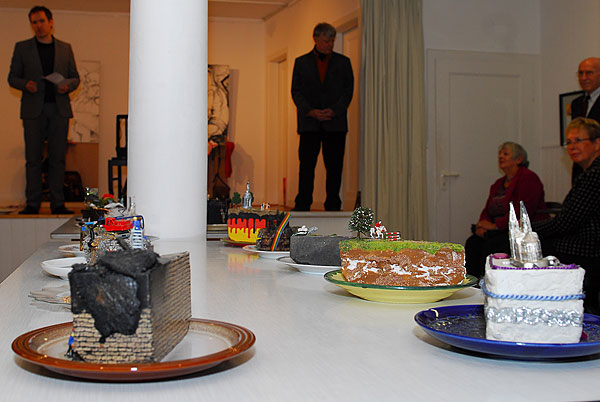 Eine lange gedeckte Tafel stand mitten im Ausstellungsraum: 20 Tortenstückchen luden zur 20. Geburtstagsfeier des Kunstkabinetts ein. Allerdings Vorsicht: Wer nur "genießen" wollte, hatte die falsche Feier gewählt. Die Tortenstückchen des Objektkünstlers Alfred Grimm haben es nämlich in sich - sie verführen allesamt zum lauten Schmunzeln bis hin zum Erschrecken.