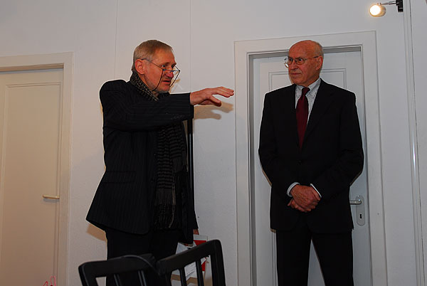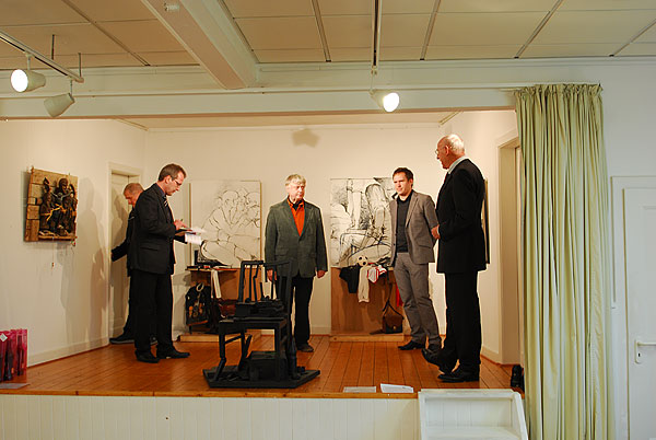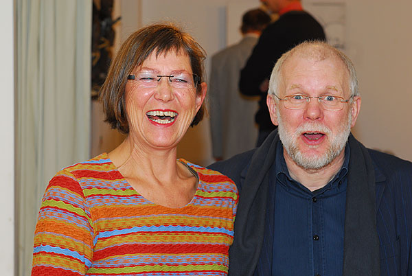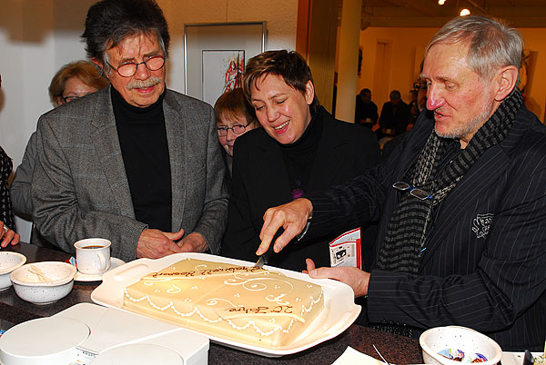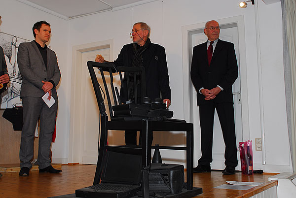 Bodo Gerono, der künstlerische Leiter des Kabinetts, stand verdientermaßen zunächst im Mittelpunkt der Geburtstagsfeier. Bürgermeister Rüdiger Gennies hob ebenso seine Verdienste hervor wie Vorstandsvorsitzender Hellmut Riebeling . Als Dank erhielt Gerono eines der interessantesten christlichen Ausstellungsobjekte des Künstlers: Den "Aufnehmer-Christus". Verborgen hinter einem schmutzigen Putzlappen erscheint schemenhaft der leidende Christus am Kreuz - ähnlich wie beim Schweißtuch der Veronika. "Er ist es, der den Dreck der Welt hinwegnimmt", erklärt der Künstler diese Objektfigur.