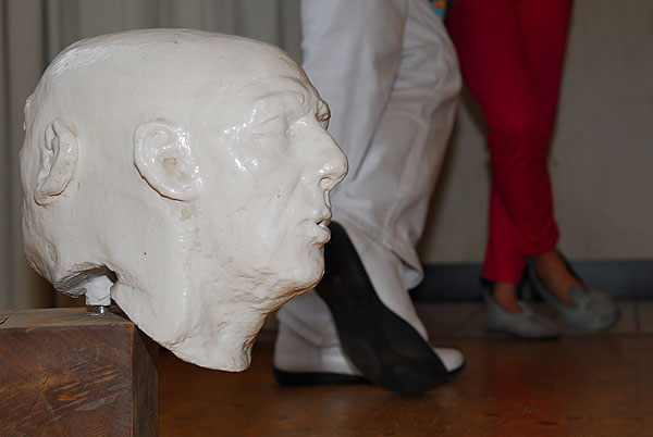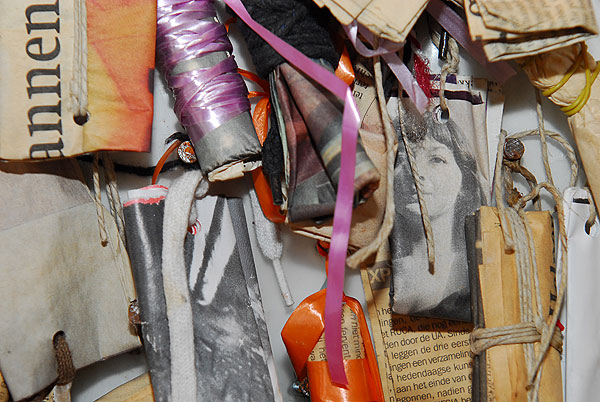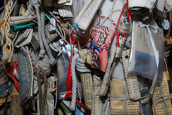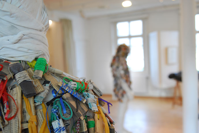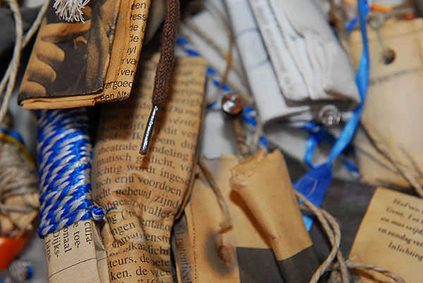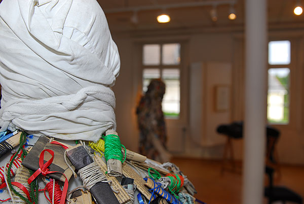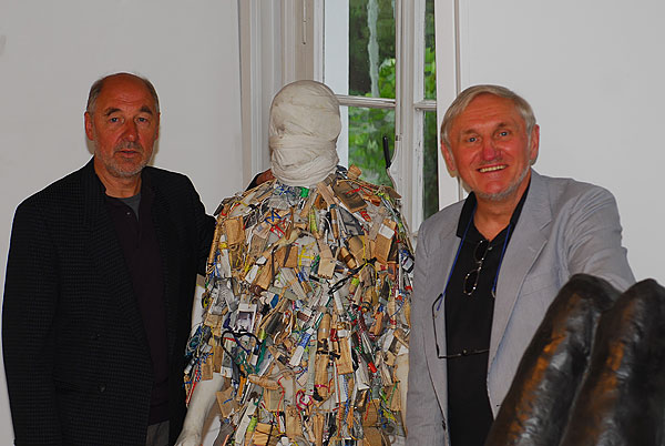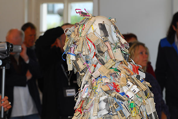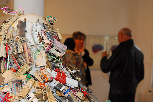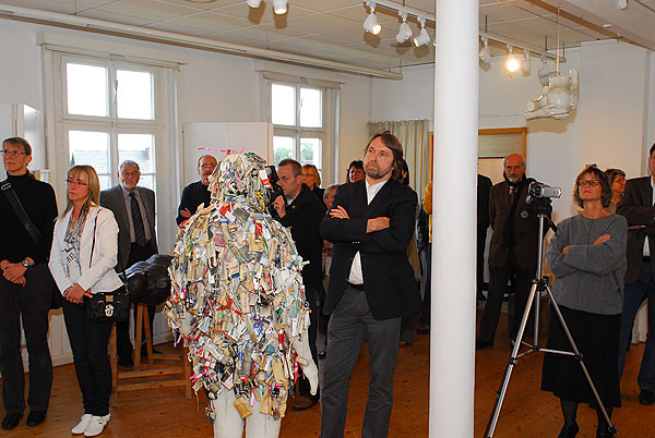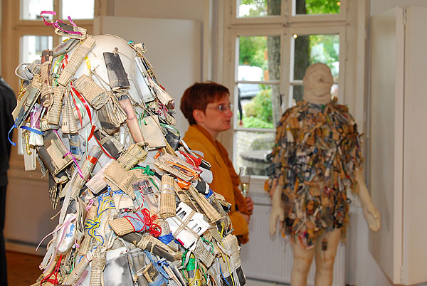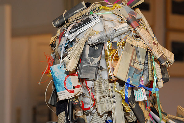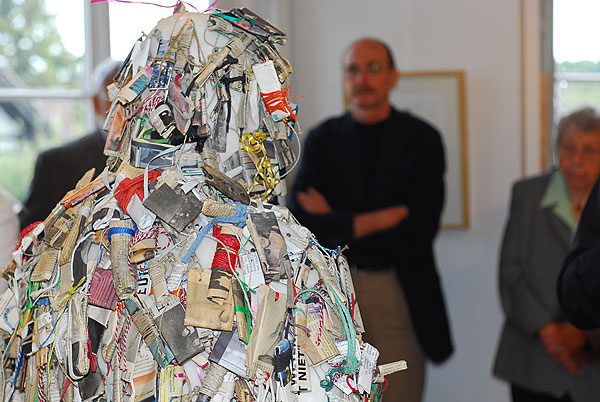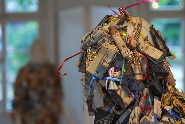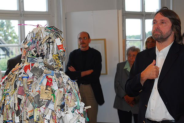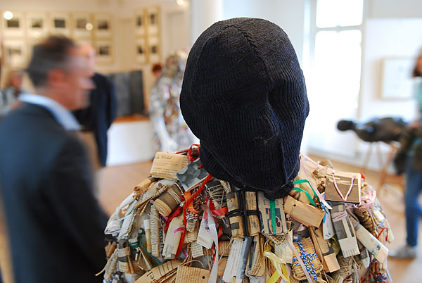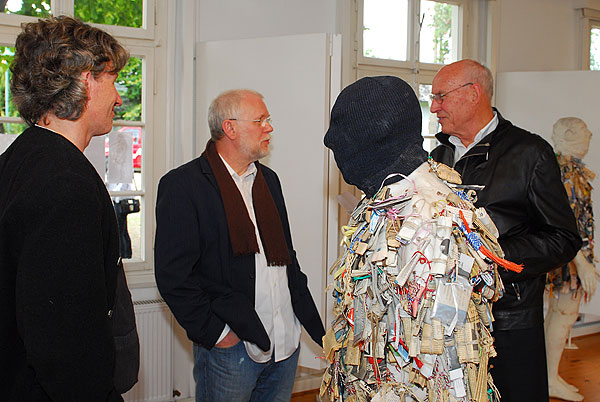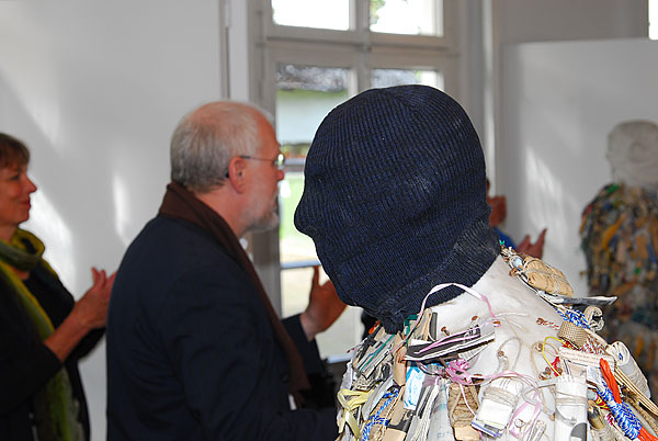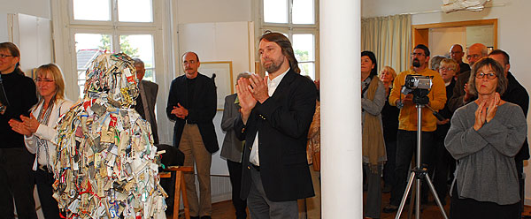 Über und über bedeckt mit gerollten und anderweitig verpackten Zeitungsartikeln, sind sie derzeit die eigentlichen Stars im KUNST KABINETT HESPERT. In seiner Einführung in die Arbeiten de Bufs zeigte Gerono zahlreiche überraschende Details auf. Alle Skulpturen sind vom Künstler aus Ton gefertigt. Spricht die Optik anfangs dagegen, so wird schon bei einem leichten Fingerklopfen die charakteristische Haptik des Materials deutlich. Die Zeitungsartikel entpuppen sich bei näherem Hinsehen allesamt als Kunstkritiken - aus denen jetzt wiederum Kunst entsteht.