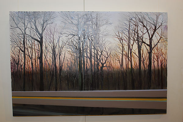 Im zweiten Themenkreis - Landschaften neben dem Autobahnasphalt - eröffnet Mathias Perlet eine imaginäre Tiefendimension und Doppelsicht. Der autorasende Mensch des 21. Jahrhunderts nimmt Landschaft nur noch als vorbeihuschenden Schatten ohne Eigenleben wahr. Er ist auf das Parallelband des grauen oder schwarzen Asphalts fixiert. Und doch erblüht inmitten der grauen, blattlosen November-Landschaft ein rosaroter Schimmer der untergehenden Sonne: Poesie und Hoffnung neben der Autobahn. Es sind mutmachende Bilder einer modernen Romantik, welche sich nicht in Herzschmerz flüchtet, sondern nach vorne blickt und Hoffnung macht.