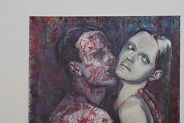 In fast photographisch deutliche Menschenportraits setzt Mathias Perlet zur Verdeutlichung der Seelenzustände verschiedene Tiere. Doch auch diese sind ambivalent, seien sie noch so naturgetreu und wunderschön gemalt: der Wolf oder Hund erscheint vordergründig als vertrauter Begleiter und zuverlässiger Wächter, zugleich aber auch als gefährlich animalisches, verführerisches Element. Die Katze blickt den Betrachter sprechend an und doch spürt man ihre Krallen, die sie jederzeit ausfahren könnte.