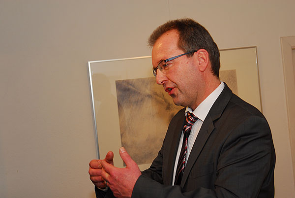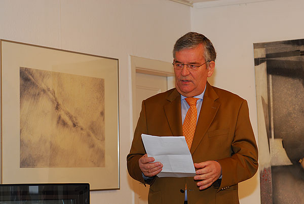 Bodo Gerono, der Direktor des KUNST KABINETT HESPERT, fand warme, persönlich Worte für seinen Freund Zehnder. Drei Dinge bewundere er an ihm: zum ersten seine fachliche Substanz und Tiefe und zugleich seine Weite. Zehnder sei ein "begnadeter Redner", was er bereits mehrfach bei Ausstellungseröffnungen in Hespert, der Theatergalerie Gummersbach oder auf Schloss Homburg bewiesen habe. Als letztes hob er Zehnders "tiefen Glauben ohne Doppelmoral" hervor. Er sei für ihn ein Vorbild gelebten Christseins. Als Dank übergab er ihm drei Arbeiten von Künstlern, welche in Hespert ausgestellt hatten.